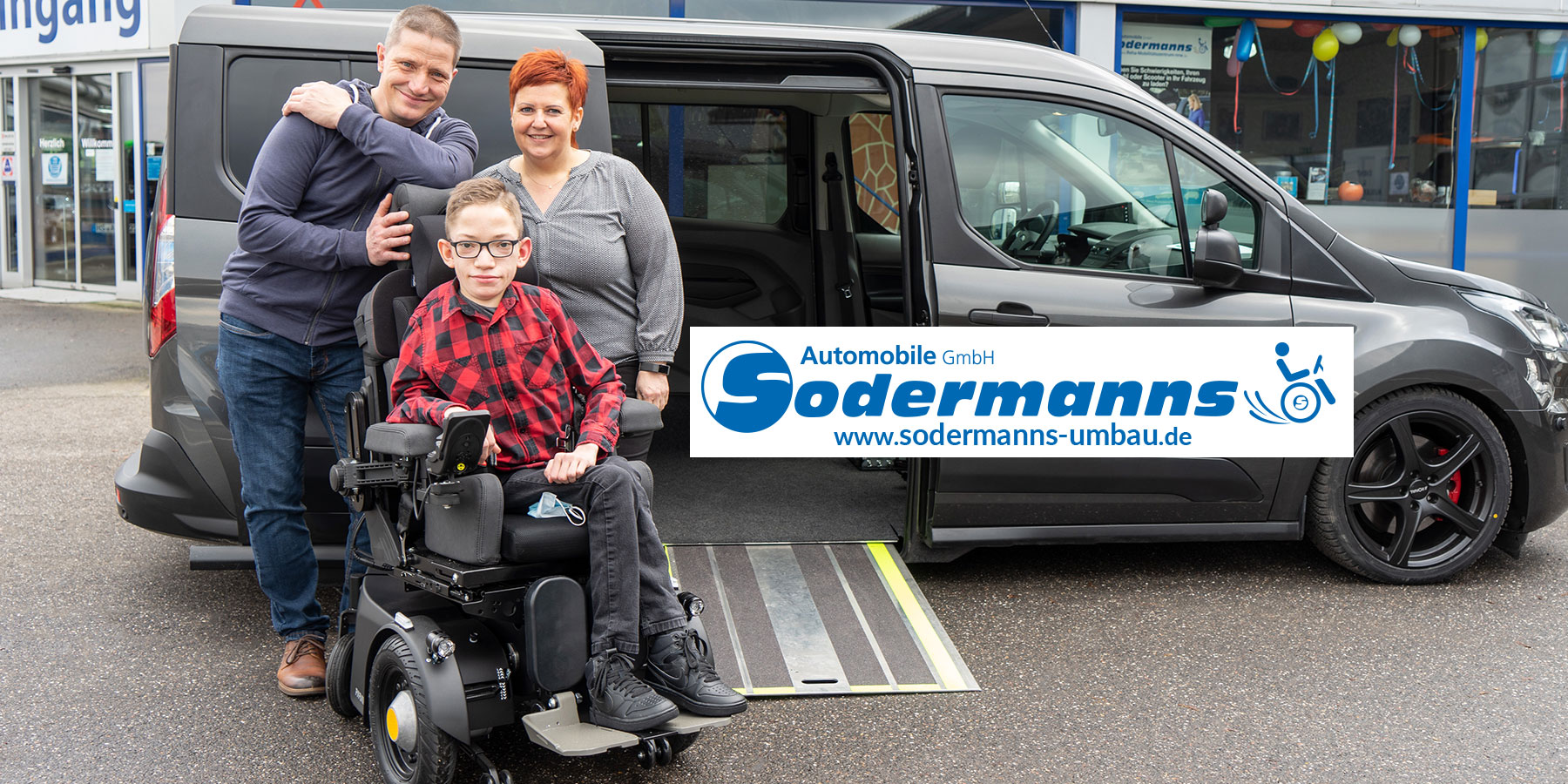 Jonas Kaiser mit Eltern. Führerschein bei Sodermanns absolviert und stolz vor seinem ersten Auto mit Joystick-Unterstützung